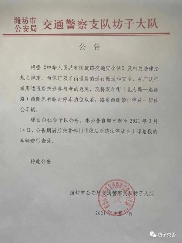 坊子交警发布公告将取消双羊街(北海路——渤海路)两侧临时停车位!禁止停放一切社会车辆!3月14日后开始查处违停!相互告知!来源:坊子交警、潍坊新闻头条来源: 潍坊高新传媒