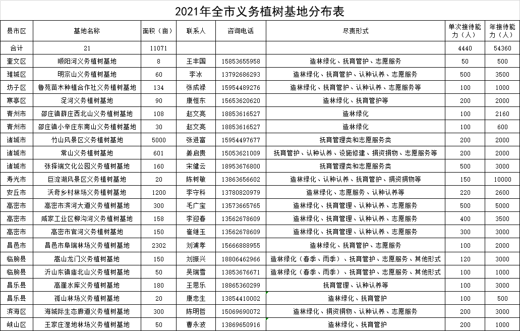 一年一度的植树节即将来临,为解决广大市民义务植树需求,潍坊市自然资源和规划局确定了全市21处义务植树基地,现将名单公布,欢迎广大市民在做好疫情防控的前提下,积极参与义务植树活动。