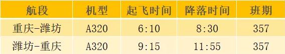 预计7月10日起潍坊机场将新开通重庆=潍坊航线本航线由华夏航空执飞每周三、五、日各一班特惠机票420元起。具体航班时刻以实际执飞为准。新航线的开通,不仅仅让潍坊人民能够直接打飞的去网红城市重庆打卡,还