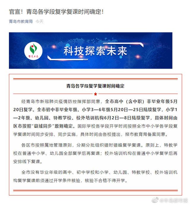 青岛市明确各学段学生开学时间