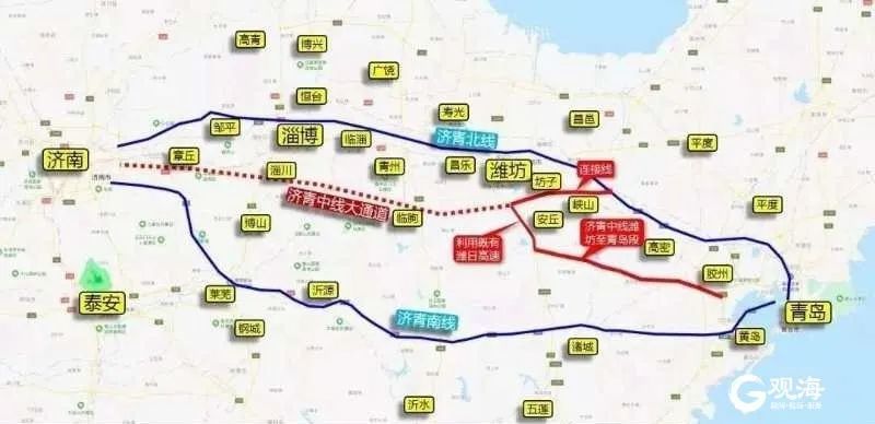 潍坊至青岛高速公路(济青中线)是山东高速公路网“九纵五横一环七射多连”重要组成部分,西起潍日高速,途经昌乐县、安丘市、坊子区、峡山区、昌邑市、高密市、胶州市7个县市区,与胶州湾高速相接(营海口南3.5公里处),全长约130公里,主线双向六车道高速公路标准设计,设计速度120公里/小时。