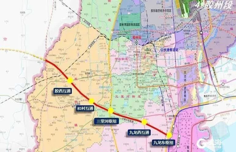济青高速中线(胶州段)长23公里,涉及胶西、三里河、九龙3个办事处,共设互通立交5个(2个枢纽:三里河枢纽、九龙东枢纽;3个落地互通:胶西落地互通、杜村落地互通、九龙西落地互通),概算总投资约52亿元。该项目建成后,对胶州市提升交通枢纽地位、服务上合示范区和胶东经济圈一体化建设具有十分重要的意义。