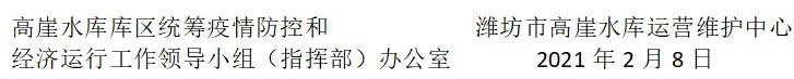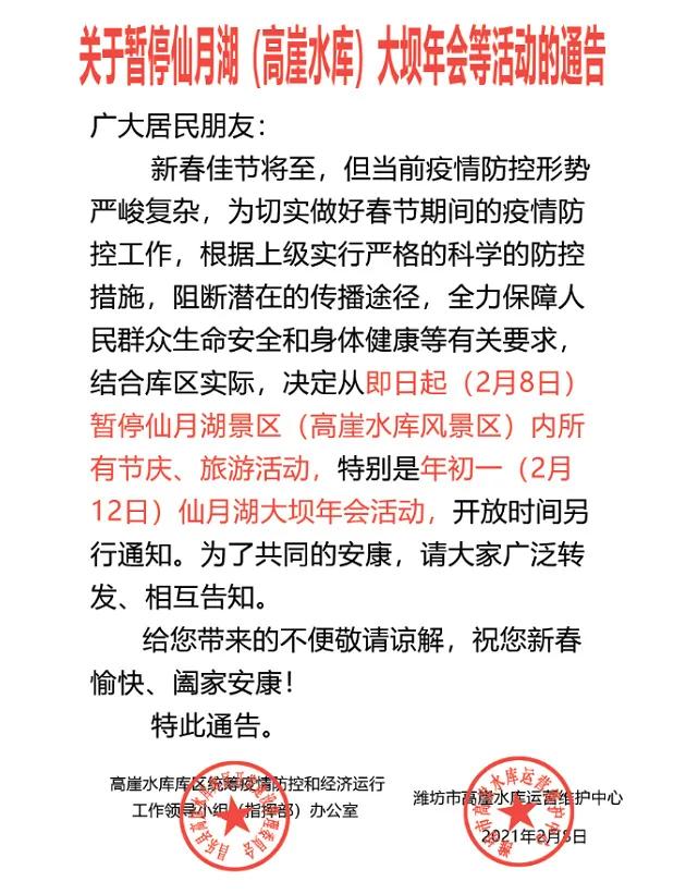 新春佳节将至,但当前疫情防控形势严峻复杂,为切实做好春节期间的疫情防控工作,根据上级实行严格的科学的防控措施,阻断潜在的传播途径,全力保障人民群众生命安全和身体健康等有关要求,结合库区实际,决定从即日起(2月8日)暂停仙月湖景区(高崖水库风景区)内所有节庆、旅游活动,特别是年初一(2月12日)仙月湖大坝年会活动,开放时间另行通知。为了共同的安康,请大家广泛转发、相互告知。