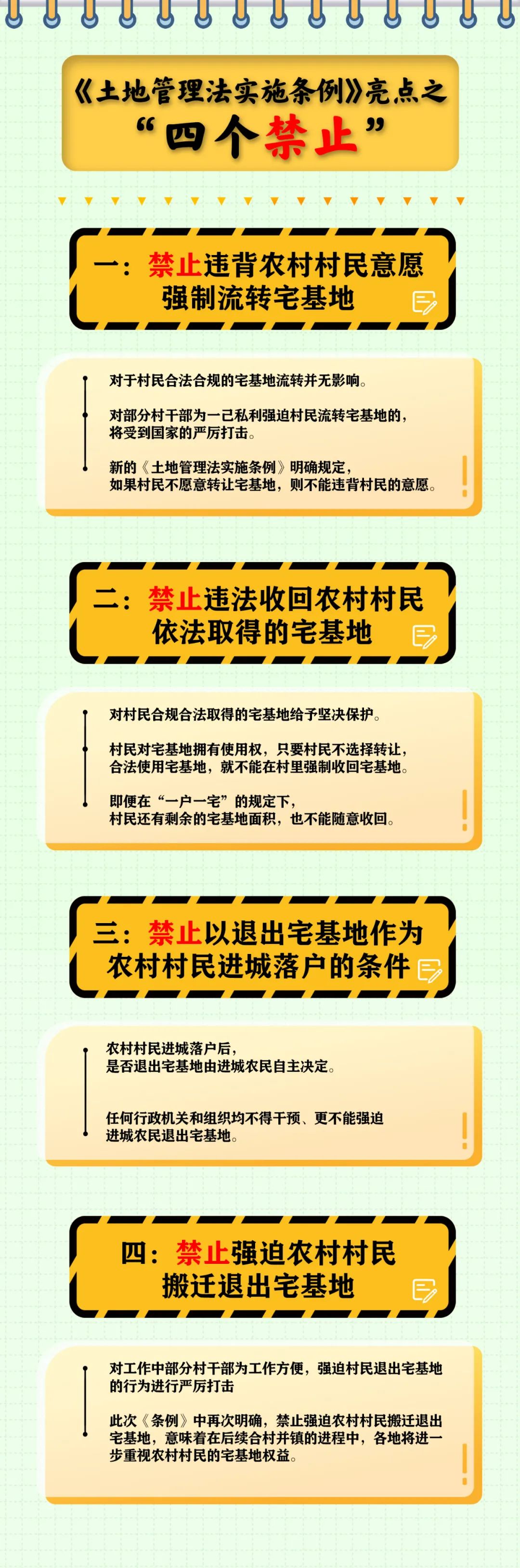 禁止违背农村村民意愿强制流转宅基地,禁止违法收回农村村民依法取得的宅基地,禁止以退出宅基地作为农村村民进城落户的条件,禁止强迫农村村民搬迁退出宅基地。