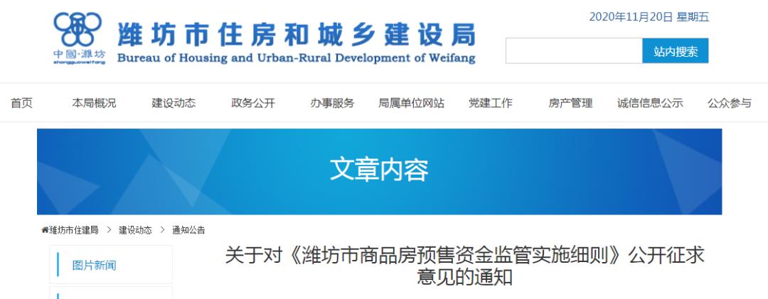 近日,潍坊市住建局发布《潍坊市商品房预售资金监管实施细则》公开征求意见的通知为进一步加强我市房屋交易监管,保障房屋交易安全,维护交易当事人合法权益,促进我市房地产市场平稳健康发展,根据有关法律法规和《