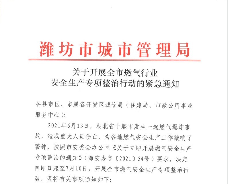 湖北省十堰市“6.13”燃气爆炸事故发生后,潍坊市委、市政府主要领导高度重视,立即部署开展全市燃气安全整治行动,要求举一反三,深入排查整治燃气安全隐患。潍坊市城管局当日紧急下发《关于开展全市燃气行业安