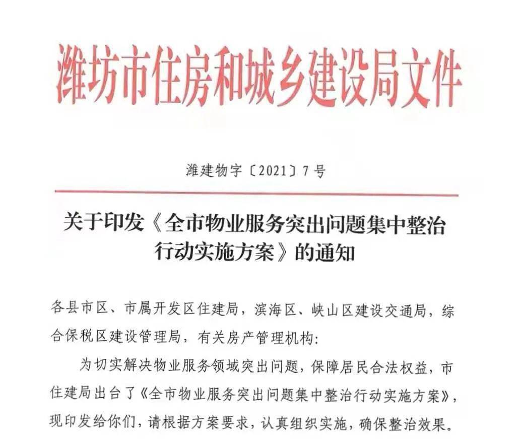 5月22日,潍坊市住建局印发《全市物业服务突出问题集中整治行动实施方案》,将围绕“物业服务、停车管理、环境卫生、安全管理、公共收益、物业交接”六项突出问题开展集中整治。整治行动自5月24日起至11月3