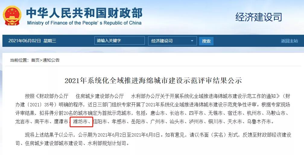 6月2日,财政部网站公示了全国海绵城市建设示范城市入围名单潍坊作为全省唯一地市参评在入围的20个城市中名列第三↓根据《财政部、住房城乡建设部、水利部关于开展系统化全域推进海绵城市建设示范工作的通知》,