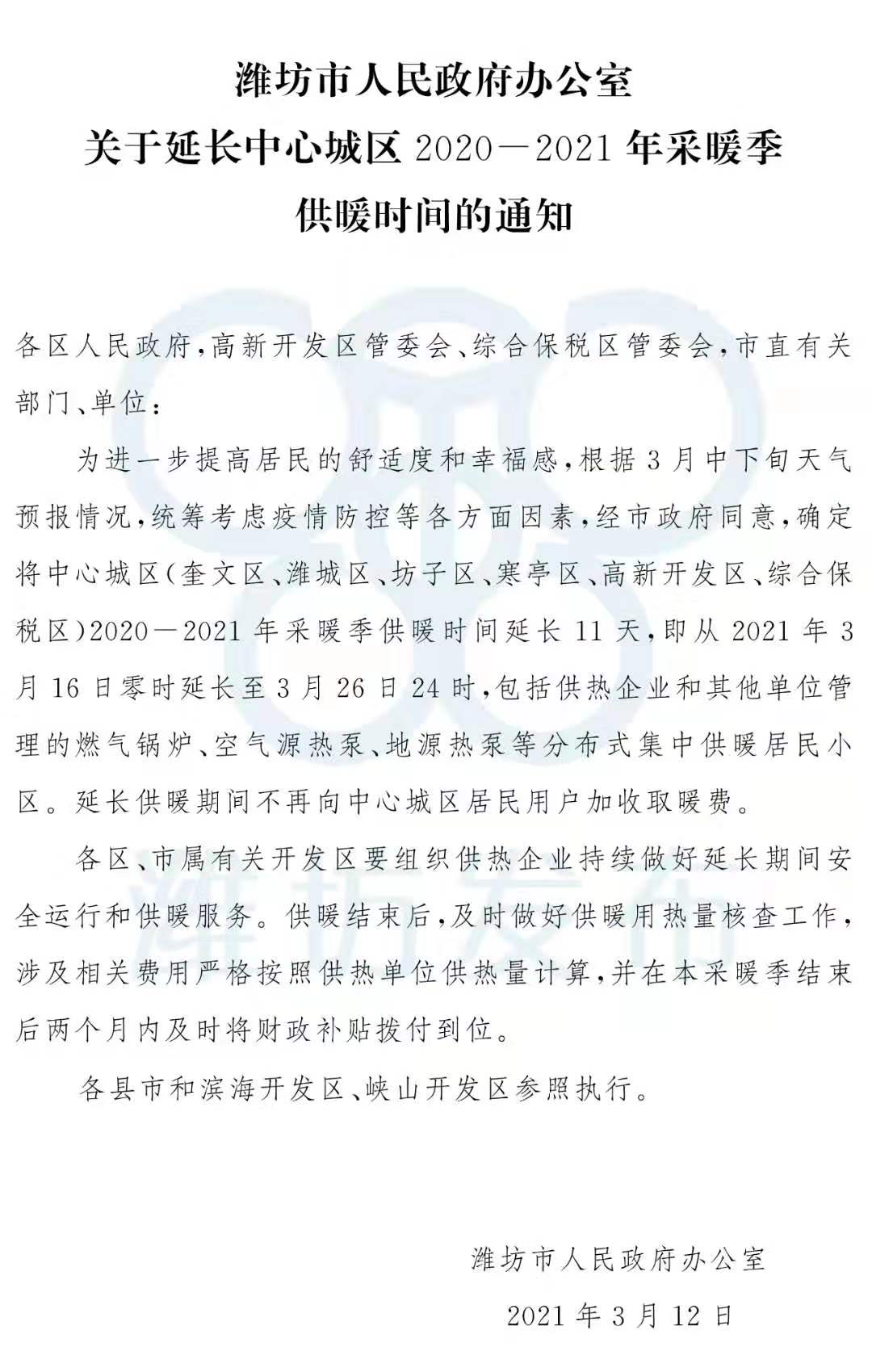 大众报业·大众日报客户端 2021-03-15 19:12:38为切实提升城区居民的幸福感和获得感,潍坊市确定将中心城区2020-2021年采暖季供暖时间延长至3月26日,加上去年底城区提前供暖时间,