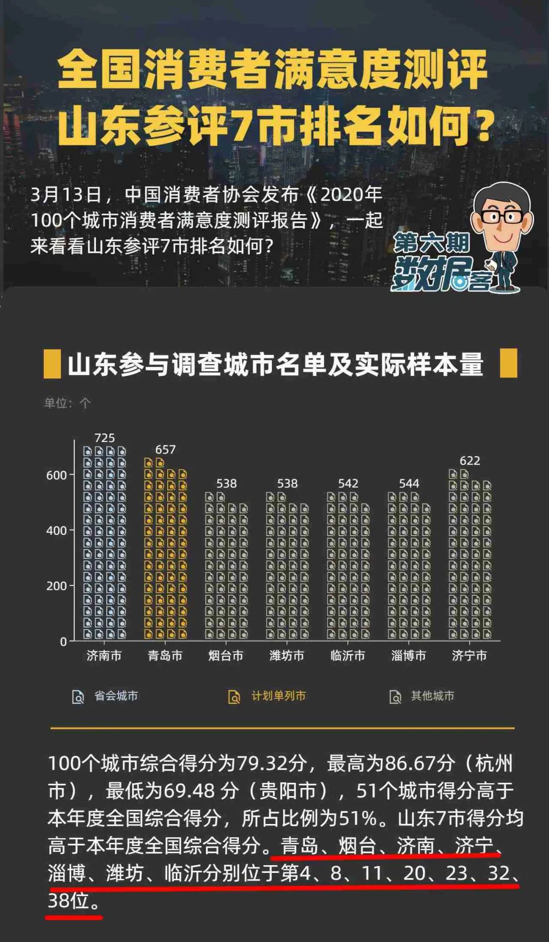 3月13日中消协向全社会发布《2020年100个城市消费者满意度测评报告》潍坊居全国第32位!据了解潍坊市已连续四年纳入消费者满意度测评城市来源:大众日报客户端