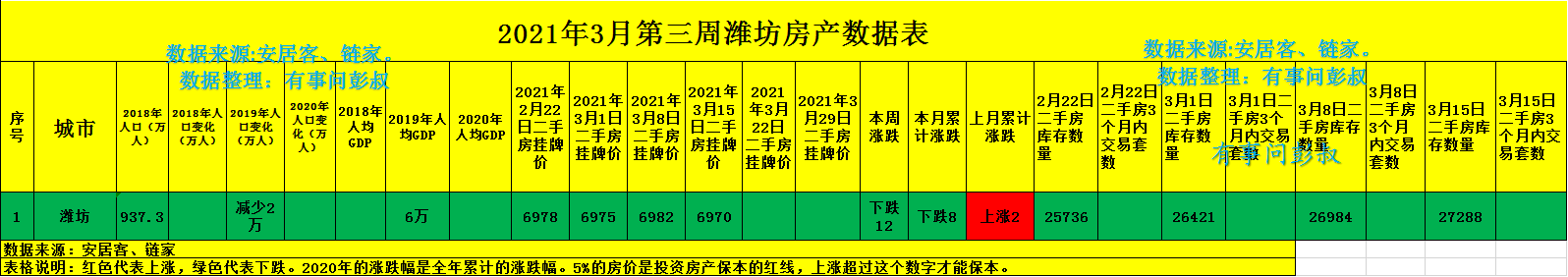 潍坊楼市2021年3月第三周数据出炉,其中:一、潍坊楼市二手房挂牌价从6982元变为6970元,本周下跌12元,持续下跌。二、潍坊楼市近三周在售二手房数量为26421套,26984套,27288套,持